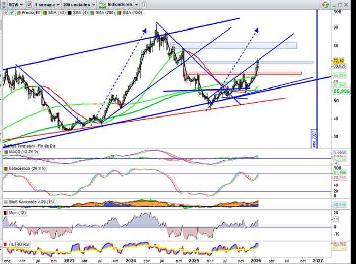 En desarrollo semanal, pendientes de cierre de esta semana, el valor se mantiene en la gestión de la zona de directriz resistencia que supone inicialmente techo de Canal Expansivo a seguir en evolución alcista del valor; zona 72,50€ / 73€ esta semana y de la misma manera en la gestión de la zona 70,80€ / 71,60€ a configurar en el corto plazo como soporte o resistencia, los indicadores a favor de la tendencia para dejar esta zona como soporte.