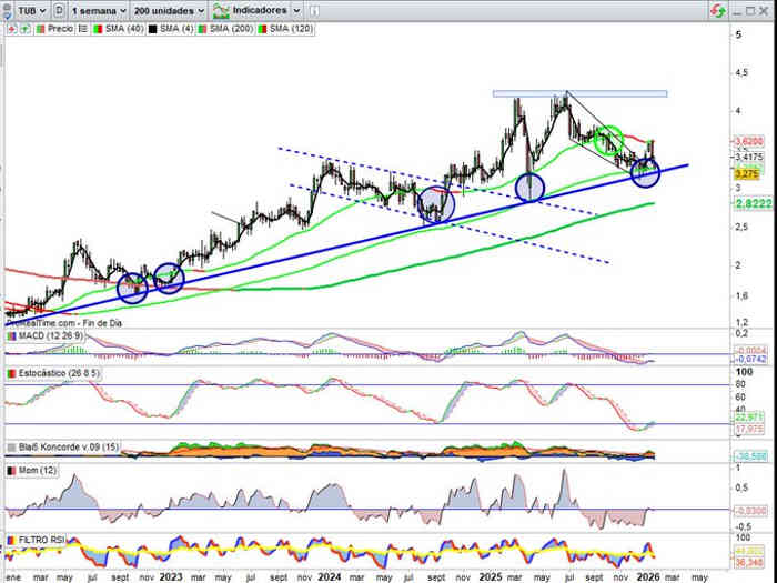 En desarrollo semanal, pendientes de cierre de esta semana, el valor se mantiene en la gestión de la zona soporte de la directriz de tendencia alcista, zona 3,22€ / 3,20€ en estos momentos y por arriba la interesante o importante Media Móvil 120, ahora por zona 3,275€, el precio de cierre de ayer.