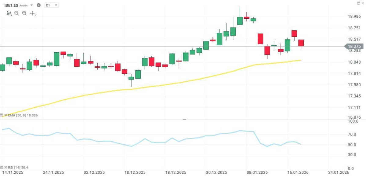 A pesar de la volatilidad presente en los mercados bursátiles en este inicio de año, Iberdrola cae un leve 0,6% en el acumulado del 2026, manteniendo un perfil de alta estabilidad. Su cotización fluctúa por encima de la media móvil exponencial de 50 sesiones (línea amarilla del gráfico).