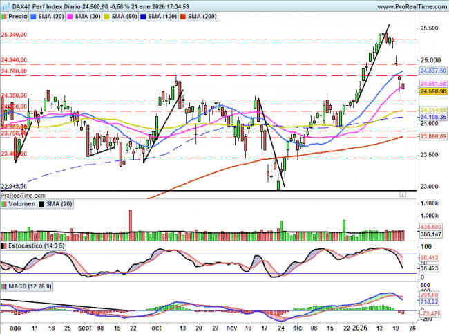 A corto el nuevo soporte relevante queda claro que pasa a ser el nivel de 24400 puntos por tratarse del mínimo alcanzado este miércoles.