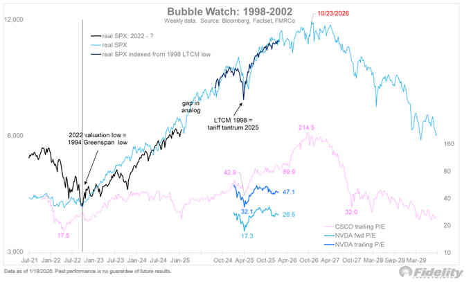 Aplicando esta idea al comportamiento del SP500 durante la formación de la burbuja tecnológica de finales de los años ´90 comparado con el de los últimos años, se observa una rima casi consonante o imperfecta, es decir, un parecido destacable con una evolución casi igual hasta la fecha y que proyecta un desarrollo de máximo interés para próximos meses (perfectamente alineado con las proyecciones aquí esbozadas en post del 25 de noviembre: Hipótesis «melt up» bursátil.)