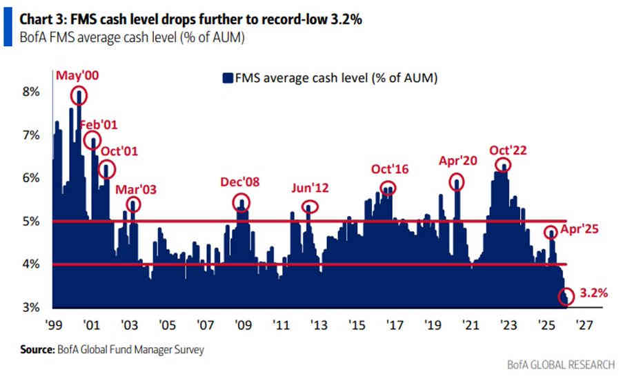 Y otra rima se encuentra en el nivel de posicionamiento de los grandes gestores de fondos, cuyos niveles de efectivo en cartera han caído hasta niveles mínimos históricos, optimismo total! El último informe de la encuesta de Bank of America «Global Fund Manager Survey», indica que el nivel de efectivo ha caído al nivel mínimo desde 1999 (sólo unos meses antes del pinchazo de la burbuja tech).