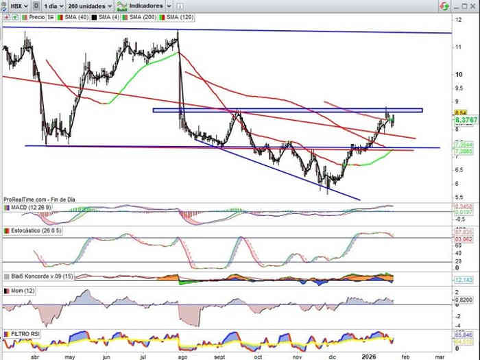 Cierres por encima de 8,60€ importante, por tanto, y confirmativos perforando el rango hasta 8,80€ y sobre ello hacer soporte o apoyo confirmativo de la proyección alcista hacia sus máximos históricos, de corta historia bursátil todavía.