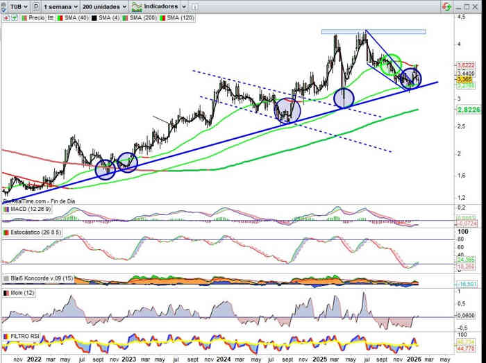 Escenario TUBACEX de corto plazo ahora que tenemos confirmada la posición de Víctor Urrutia Vallejo, una de las mayores fortunas vascas, ahora en este valor, confirmando ha estado comprando todo lo que se vendía en escenario consolidación del activo, si se confirma ahora en relanzamiento, mucho ganado para la proyección del escenario del Gráfico Mensual, pero paso a paso, no descarto posicionamiento de nuevos accionistas significativos en actuales credenciales técnico / fundamentales del valor. Escenario de corto plazo que sería sobre Gráfico más dinámico y referenciado a Gráfico Semanal confirmativo y de proyección sobre Gráfico Mensual…..