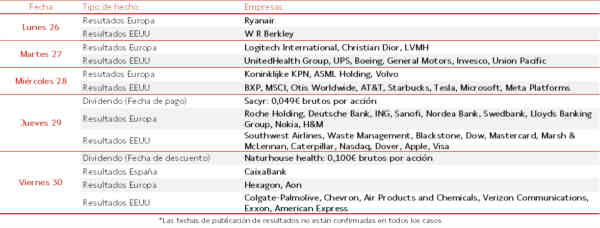En el ámbito empresarial, destacará la publicación de resultados de Apple, Visa, Starbucks, Tesla, Microsoft, Meta Platforms, Boeing, General Motors, UPS, MSCI, Mastercard, Nasdaq y Exxon, entre otros.