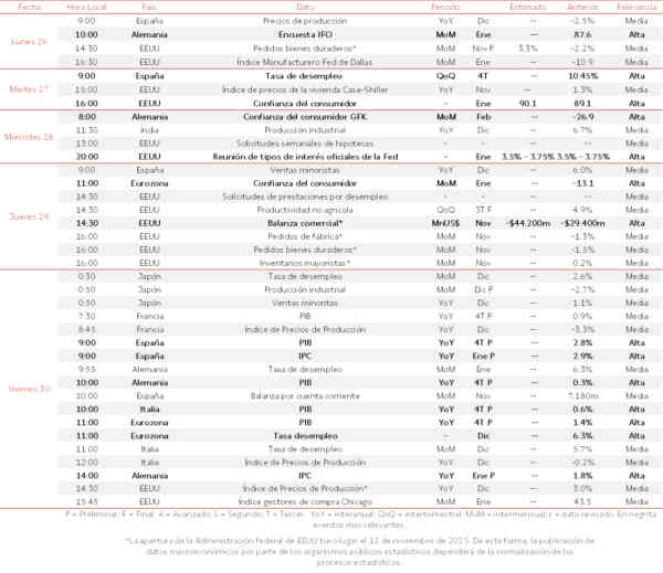 El viernes 30, será clave la publicación del dato preliminar de crecimiento del PIB durante el 4T de 2025 en la Eurozona, Alemania, Francia, España e Italia (vs. 1,4%, 0,3%, 0,9%, 2,8% y 0,6% interanual en el trimestre anterior, respectivamente). Paralelamente se conocerá la evolución de la tasa de desempleo del mes de diciembre en la Eurozona, Alemania e Italia (vs. 6,3%, 6,3% y 5,7% de la población en noviembre).