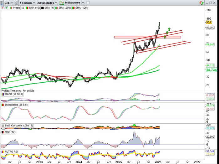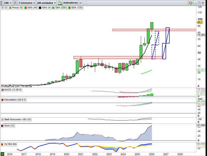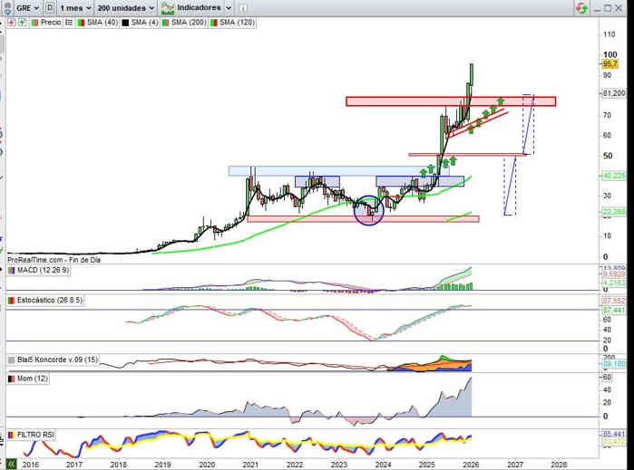 Sobre Gráfico Trimestral, recordar la zona soporte clave en estos momentos mientras continua inalterable la tendencia para seguir marcando nuevos máximos históricos y que en estas premisas técnico / fundamentales del momento puede seguir jugando un papel determinante el momento en el que las todavía petrificadas apuestas bajistas en el valor, posicionadas como tal desde mediados del 2025, desde la zona de los 60€ por acción, se decidan a mover ficha en el supuesto de que decidan comprar ya acciones para desistir de sus intenciones bajistas, vigilancia por tanto sobre las decisiones de estas posiciones cortas en sus movimientos. 3ª Vista Gráfica.