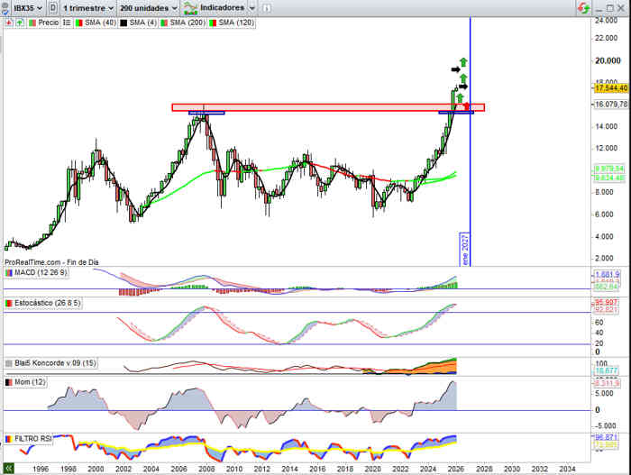 Sobre Gráfico Trimestral el cuadro técnico está representado en escenario Alcista Lateral Alcista sin que de momento se activen señales de consolidación importantes. Se mantiene la fuerte presión compradora en el selectivo español y los mercados españoles a los que representa, en jornadas de corrección puntual de momento suponiendo oportunidad de subirse a tendencia y gran capital inversor aprovechando posicionamiento o presencia inversora en cotizadas de menor capitalización de otros mercados españoles.