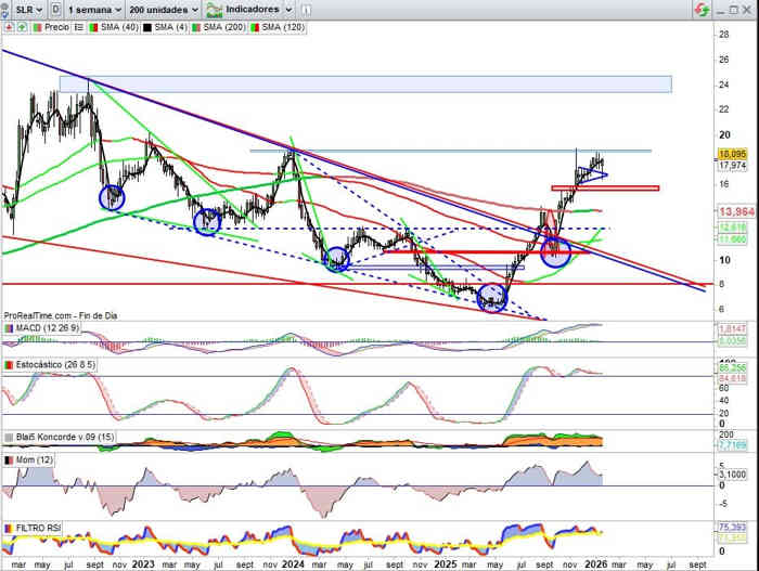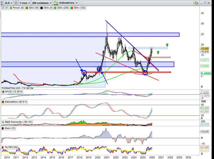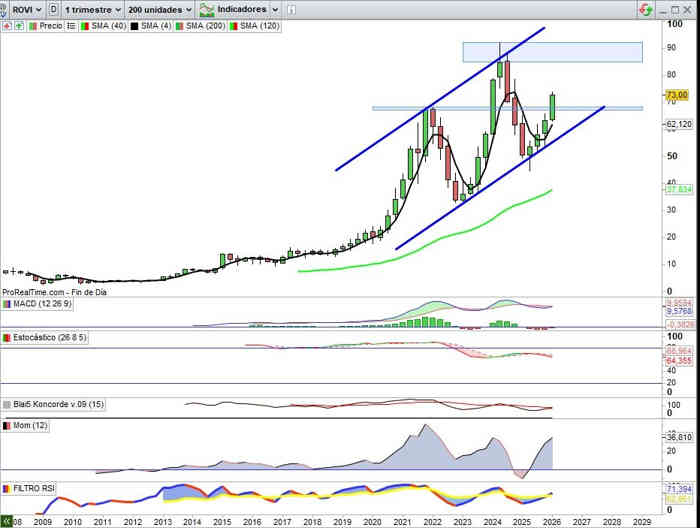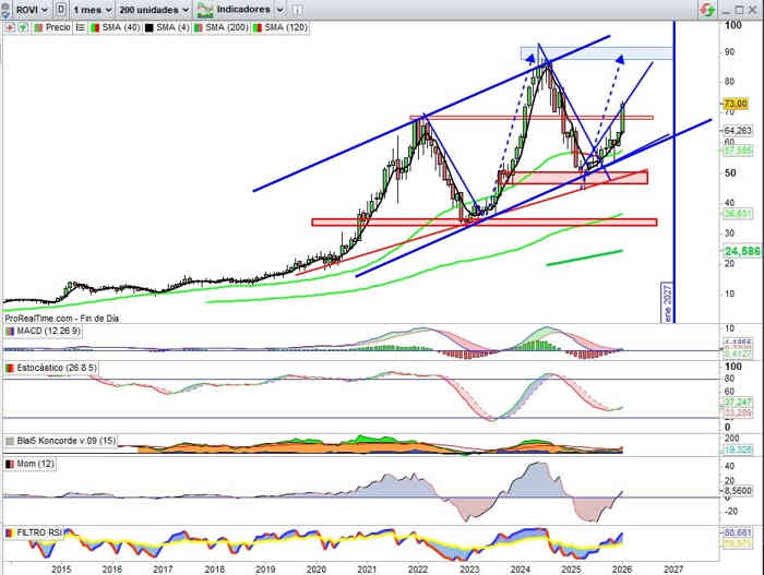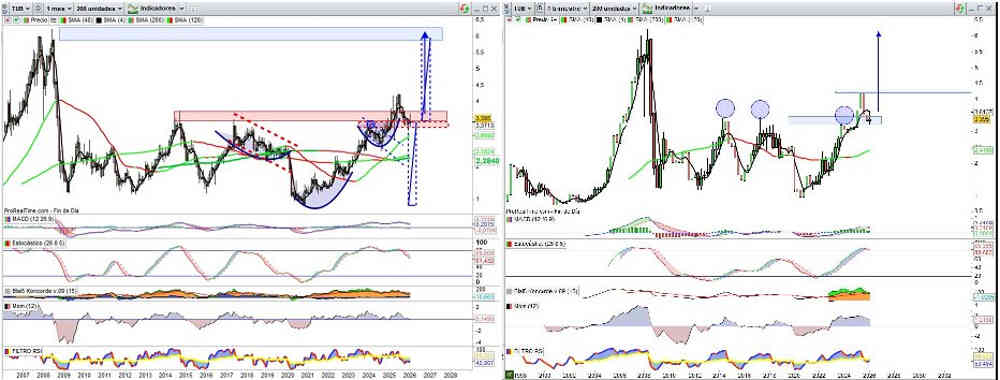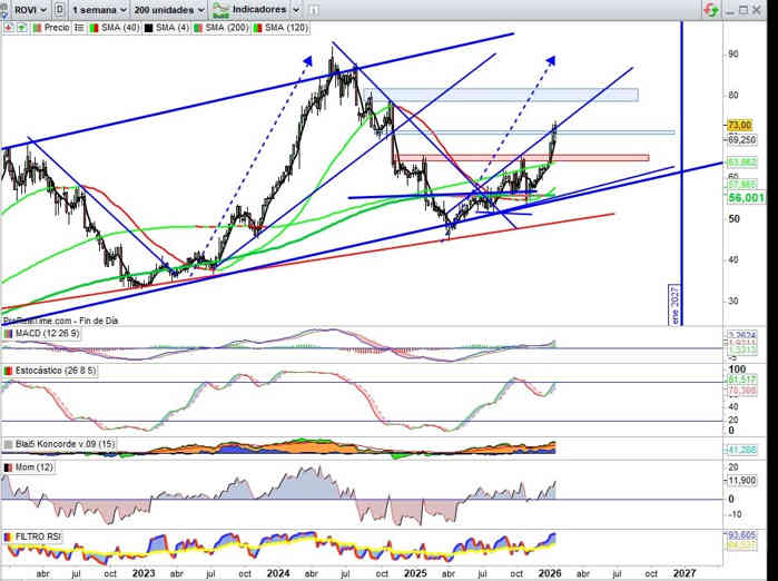 Credenciales técnicas para seguir subiendo, señal de compra y en favor de la tendencia sobre indicadores, la duda esta en si la fuerza de la tendencia mantendrá la verticalidad de la subida, pero si confirma en un peor escenario consolidación sobre referencias soporte señaladas en estas vistas, mucho positivo para confirmar proyección planteada en su momento desde la zona de soporte clave para alcanzar objetivo técnicos del desarrollo estructural alcista en toda su amplitud hacia máximos históricos marcados en el anterior movimiento alcista, en actuales credenciales sobre expectativas de negocio, todo bien armado para confirmar este activo como de alto potencial de cara a desarrollo del ejercicio 2026.