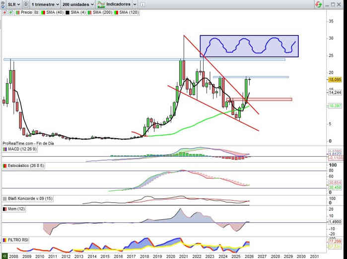 Recordando que en esta vista Gráfica los 3 Soldados Blancos reflejadas en las velas de los tres trimestres anteriores sugieren alta connotación alcista sobre este activo para proyectarse a los comentados máximos históricos, y estamos hablando de una potencial zona de precios del orden entre los 24€ y 31€, siguiendo la correspondencia en GRENERGY en su situación actual, sobre expectativas de negocio también en SOLARIA bajo mi punto de vista en credenciales técnico y fundamentales para nuevos máximos históricos en cuerpos de vela, es decir, que no sean solo mechas sobre ese máximo histórico actual.