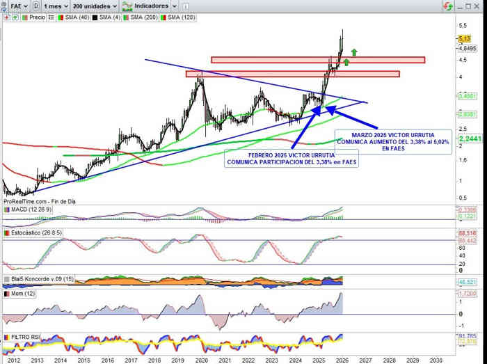 VICTOR URRUTIA EN FAES FARMA (1ª Vista Gráfica) En Febrero de 2025 comunicó este hombre una posición inicial en FAES del 3,338%, un mes después la aumentó al 5,02%, a este hombre le encanta, como a otros muchos subirse a tendencia aprovechando recortes técnicos puntuales. Lo recuerdo como si fuese hoy mismo, tampoco hace mucho tiempo de ello como para tener tan poca memoria, pero es que tenía este valor en radar en ese momento, como creo comuniqué en en el Canal a lo largo del año reciente terminado, estando ya a día de hoy en el valor. Pero a lo que vamos del lado manipulativo como tantos otros ejemplos ya señalados.