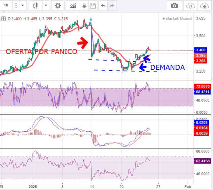 Sobre Gráfico Semanal con el valor habiendo probado nuevamente la directriz de tendencia que activa capital comprador, y esta semana de alta volatilidad provocada por más ruido MONTAÑA RUSA de TRUMP mínimos del valor en barrida sobre la directriz alcista marcando la mecha la activación de Capital Inversor, entra el Sr. Victor Urrutia Vallejo y el valor deja una vela martillo de recuperación, si la barrida como precursora de movimiento alcista hace su trabajo ahora en connotaciones alcistas de la Cuña ya reflejada en anteriores siguiendo la tendencia.
