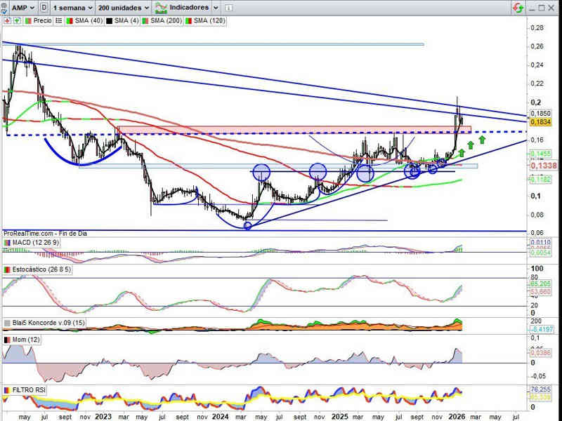 Interesante el tono positivo evolución porque tras retroceso de la semana pasada como 2ª consecutiva supone esta semana activar relanzamiento alcista y continuidad de tendencia sobre zona soporte señalada como técnica inicial de continuidad alcista tras fase consolidación del movimiento al alza tan vertical que ha protagonizado recientemente, de momento buena señal que se cumpla apoyo en zona señalada como soporte en rango 0,1750€ / 0,1680€ en esta vista Semanal, y los máximos esta semana probando 1ª de las directrices resistencia que venimos viendo en rango como clave para otro nuevo paso alcista estructural que lleven a confirmar niveles soporte de consolidación.