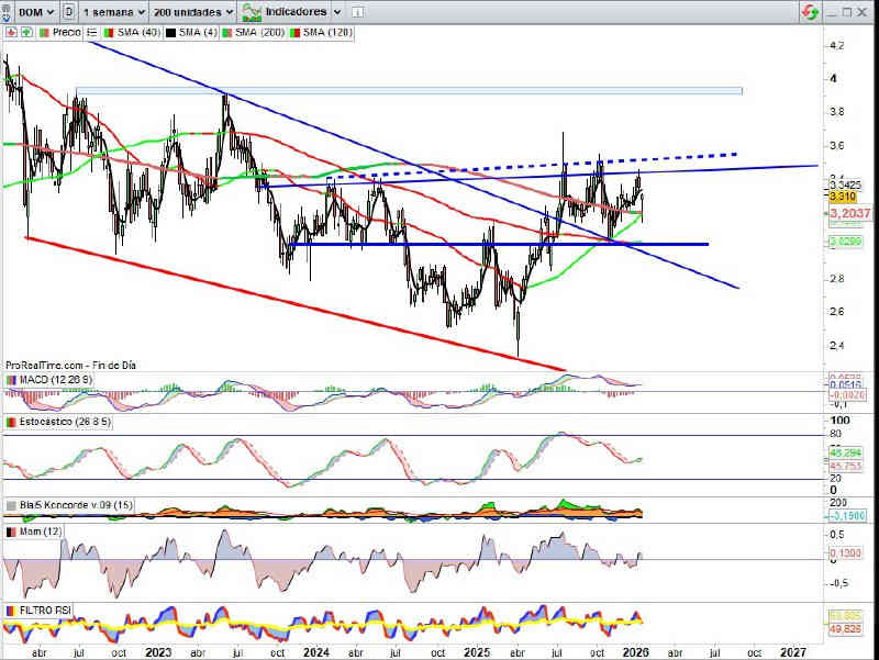 Sobre Gráfico Mensual, sin variación de momento en lo que llevamos de Enero, la semana pasada solo ha servido en alta volatilidad para dejar el activo de momento como estaba, en proyección y gestión de la resistencia clave, esperando ver que nos confirma el cierre de mes esta próxima semana. Calve en resistencia cierres de mes por encima de los 3,45€.