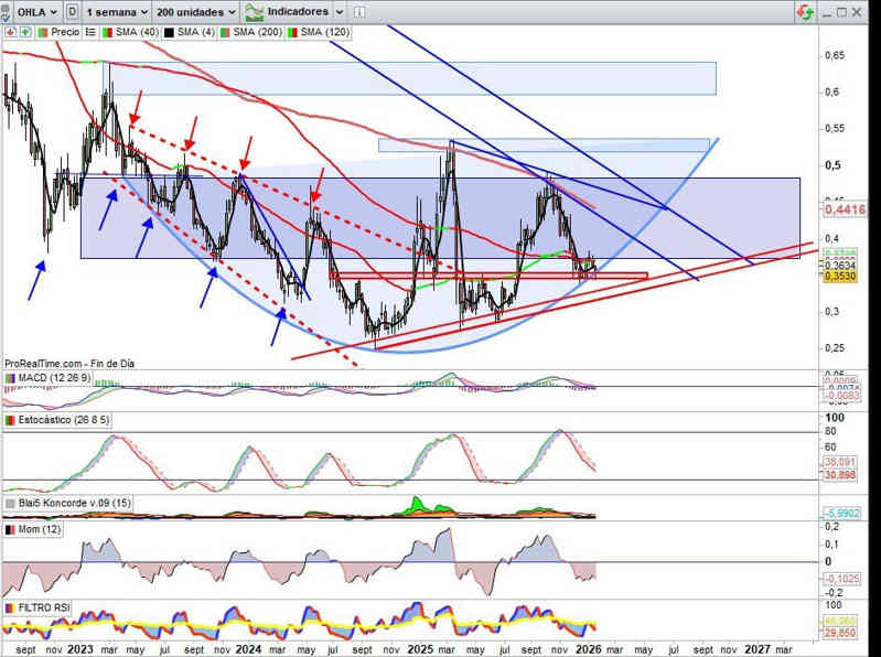 Y cierre negativo en este caso de OHLA que ya sabéis cuando son en este sentido me gusta mirar lo positivo de los retrocesos, y en este caso positivo en los mínimos de la semana porque marcan parte baja del rango soporte inmediato establecido y el cierre como podéis ver en la vela de la semana por encima de zona alta del rango, de manera que el soporte de momento válido para activar cierto capital comprador que mantiene todo en orden técnico.