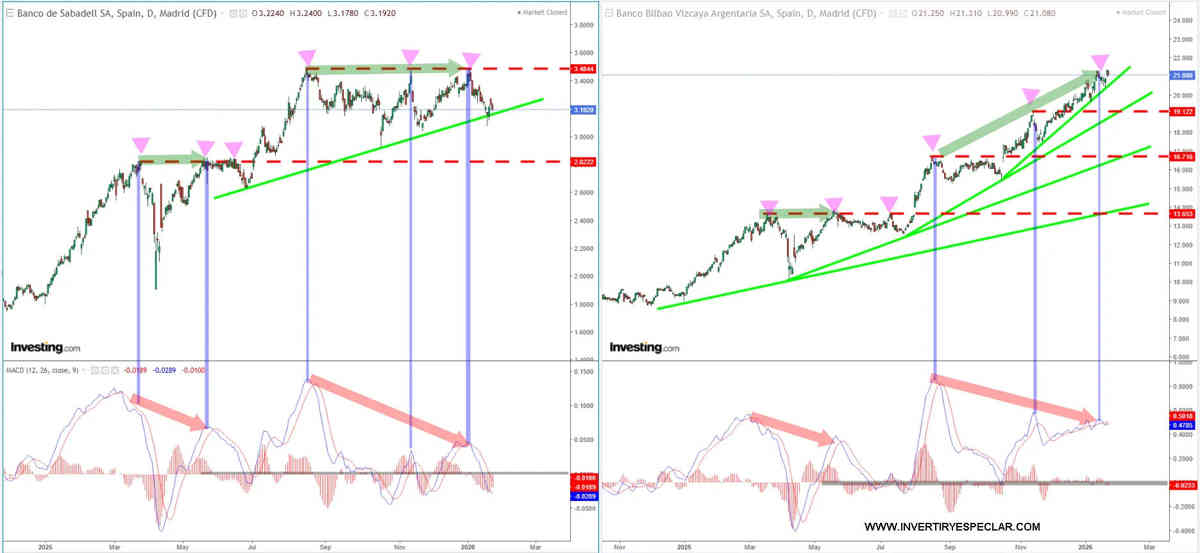 Por el lado negativo vemos en los dos bancos sendas divergencias bajistas desde el verano, esto implicaría que o se sube con resultados o las correcciones descritas se ejecutarán.