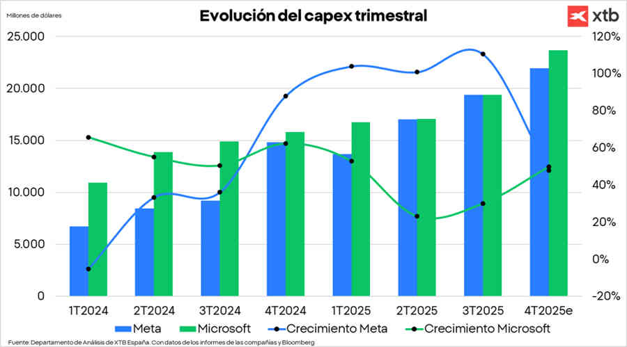 En ese sentido, el consenso de analistas de Bloomberg espera un capex trimestral para Meta de unos 21.932 millones de dólares (+47,8% interanual) y de 23.666 millones de dólares (+49,7% interanual) para Microsoft. Estas cifras ya son abultadas, por lo que si vemos un incremento superior a lo esperado podríamos ver castigo.