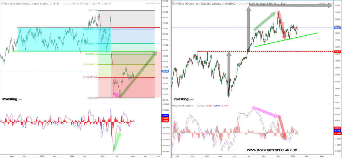 A Unitedhealth le seguimos manteniendo objetivo pullback a zona 450 dólares que además es nivel 50% de Fibonacci de su último, traumático y dramático desplazamiento bajista desde casi su techo de la serie y bueno si tenemos razón todo habría empezado por un divergencia alcista.