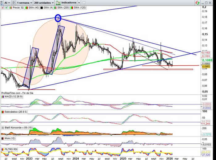 En alta volatilidad propia de este valor, de momento gestionando recordad precios de la última compra del máximo accionista, Lalo Azcona, que compró a 0,10€, pero como decía en actualización del fin de semana, nada mientras el valor no perfore resistencia desde zona 0,1070€, la señal creo la activará el propio Lalo Azcona llegado el momento por lo que ya tengo referido en posible escenario corporativo.