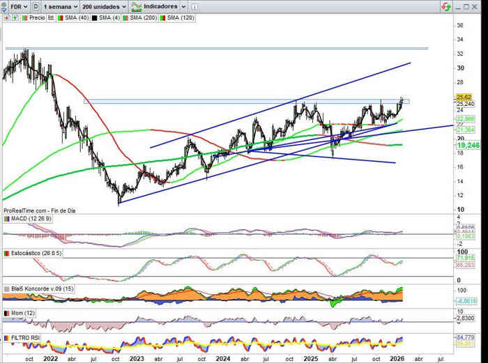 Técnicamente lo que tenemos con estas ventas, es: FLUIDRA 25,62€, sobre Gráfico Semanal en zona de resistencia clave y con todo armado de indicadores en actuales credenciales técnico / fundamentales, señal compra en indicadores y en favor de la tendencia, es decir, las ventas de este accionista y consejero de la empresa son de momento perfectamente neutralizadas por el interés comprador, la demanda sigue superando la oferta, importante vigilar por tanto si este persona vinculada termina de vender.