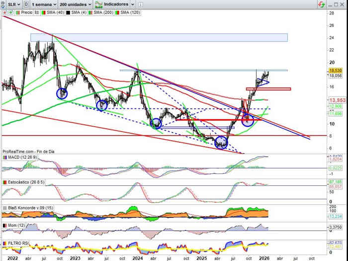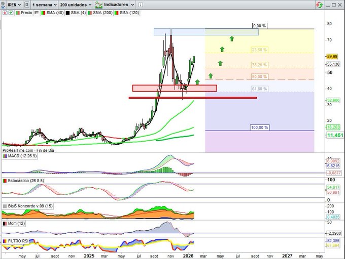 Y sobre Gráfico Mensual +10,62% a lo largo de Enero de momento, el cierre de este mes, pasado mañana, puede confirmar pese a estas ventas una muy positiva vela de perforación de resistencia clave, que si se confirma por tanto cerrando el mes de Enero, en actuales credenciales técnico / fundamentales y con el desarrollo actual del Hombro Cabeza Hombro Invertido, activaría señal de proyección de esta forma de connotaciones continuidad alcista hacia la zona de los máximos históricos y lo haría siguiendo un campo alcista Expansivo que es el que llevaría como decía en anterior vista a nuevos máximos históricos. Estructura armada con indicadores en señal compra y en favor de la tendencia.