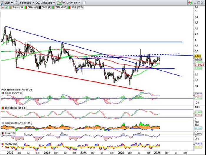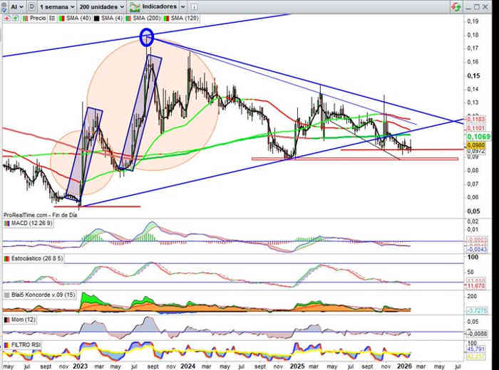 Tras las compras recientes por parte de accionistas significativos señaladas esta misma semana, pendientes de cierre semanal y de cierre mensual, a falta de dos sesiones para su visualización, de momento se presenta ya nuevamente a la resistencia clave, zona 3,45€ / 3,50€ con todos los indicadores en señal compra y en favor de la tendencia para romper y proyectar interesante Hombro Cabeza Hombro Invertido hacia la zona de los 4,45€ / 4,63€.