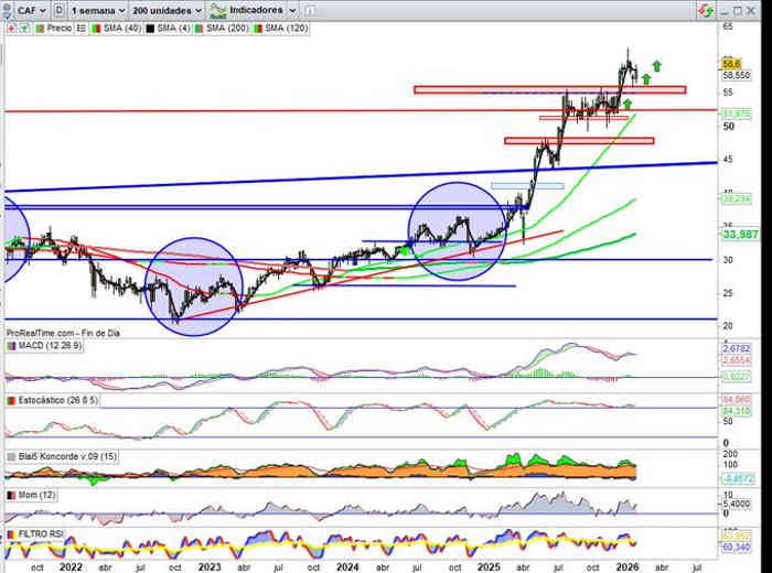 Vamos con una actualización de CAF, aunque ya lo refería esta semana en actualizaciones a mayores sobre el comunicado del nuevo contrato, pendientes de resultados del ejercicio, señalando la tendencia alcista sin señales de agotamiento de momento sobre su estructura técnica con el valor en señal SUBIDA LIBRE activada, la lógica retirada de beneficios que citan en el artículo se traduce de momento técnicamente de manera impecable en consolidación de la subida protagonizada hasta ahora, de momento en actuales credenciales técnico / fundamentales, con indicadores en señal compra y en favor de la tendencia el valor respeta la zona soporte inmediata en rango 56€ / 55€ ya señalados en anteriores sobre Gráfico Semanal.