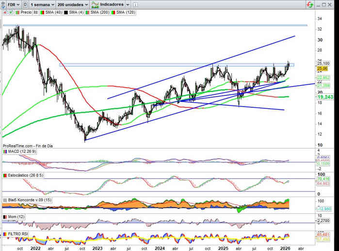 Sobre Gráfico Mensual, +8,20€ de momento a lo largo de Enero, pendientes de cierre de mes bursátil mañana viernes 30, con indicadores en señal compra y en favor de la tendencia con el valor en zona de gestión de la importante resistencia o clave de corto / medio plazo en esta vista representada en rango 24,70€ / 25,70€, cierres en este rango hasta su perforación alcista, de gestión proyección del Hombro Cabeza Hombro Invertido que el valor viene dibujando en el medio plazo.