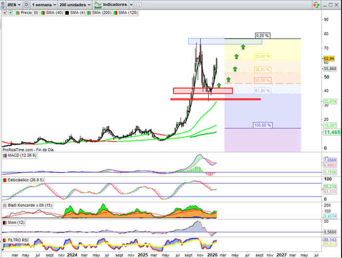 Mientras, IREN continua su escalada hacia los máximos históricos recientes, en alta volatilidad habitual de este tipo de valores, valor proyectado estructuralmente hacia la cota de los 73$ / 77$, bajo mi punto de vista, en actuales credenciales técnico / fundamentales para nuevos máximos históricos.