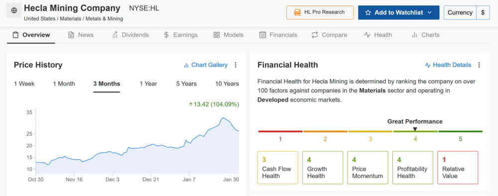 Hecla Mining destaca por una subida del 37% en lo que va de año, respaldada por una puntuación global de Salud Financiera de 3,40 (GENIAL) y calificaciones de crecimiento y beneficios “EXCELENTES”. Los analistas fijan su objetivo medio en 26,25 dólares (muy cerca del precio real de 26,32 dólares), con un ambicioso máximo de 36,50 dólares (+38% de subida).