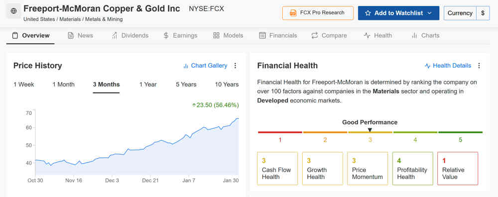 Freeport-McMoRan cuenta con una puntuación de salud financiera de 2,91 (BUENA) y “EXCELENTE” en beneficios. Con una rentabilidad anual del 28% y un precio de mercado de 65,13 dólares, el objetivo alcista de los analistas de gama alta se sitúa en el 7,7%.