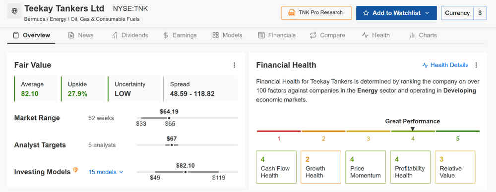 Teekay Tankers completa el grupo con una puntuación de Salud Financiera de 3,34 (GENIAL) y un flujo de caja “EXCELENTE”. Su rendimiento del 20% en lo que va de año se ve respaldado por un precio de mercado de 64,19 dólares, un objetivo medio de los analistas de 67,00 dólares y una estimación de Valor Razonable notablemente alcista de 82,10 dólares, lo que implica una subida del 27,9%.
