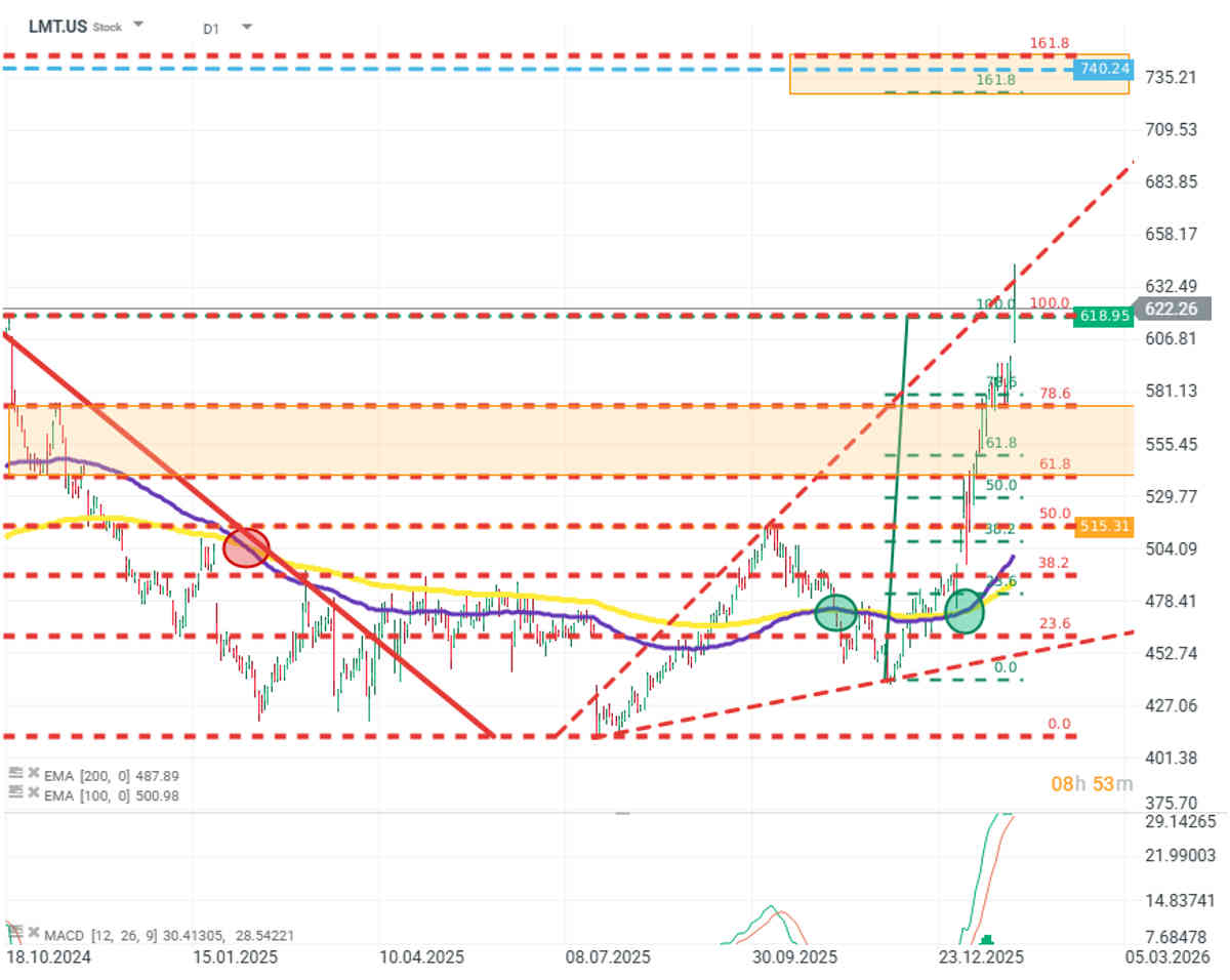 Si el precio de las acciones de Lockheed Martin se mantiene por encima de los máximos recientes, entonces, dado el impulso alcista actual y la estructura de las medias móviles EMA 100 y 200, el valor podría tener la oportunidad de seguir subiendo incluso hacia la zona de los 740 USD.Un retroceso, potencialmente reforzado por una posible señal negativa del indicador MACD, podría llevar a las acciones de Lockheed Martin hacia la zona de soporte entre el nivel de Fibonacci del 78,6% y el retroceso del 50% del último tramo alcista.