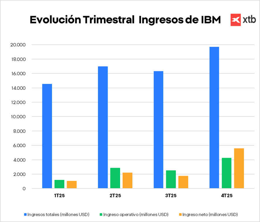 Aunque la mayoría de métricas fueron positivas, destaca especialmente el ritmo de crecimiento de la unidad de software, que ya representa casi el 50% de los ingresos totales. En los últimos trimestres, la compañía ha acelerado su crecimiento de ingresos de 14.000 millones a 19.500 millones, reflejando la capacidad de IBM para monetizar la demanda de soluciones de IA así como la estacionalidad del sector, que tiende a presentar mayores ingresos a media que se suceden los trimestres.