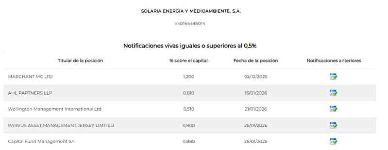 Posiciones Cortas que, si en la actualización de la semana pasada con obligación de declarar a la CNMV por encima del 0,50%, eran 5 sumando un porcentaje total del 4,40% de las acciones del Capital Social de Solaria, esta semana las apuestas bajistas siguen siendo 5 sumando un total del 4,30% de las acciones del Capital Social de Solaria.
