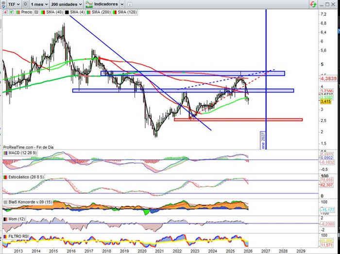 Sobre Gráfico Trimestral, que incorporamos en otra señal de tendencia bien distinta a la que marca este activo, complicada en #TEF la situación técnica al haber perdido recientemente la zona de los 3,90€ / 3,80€, ahora resistencia clave, activando un campo de proyección bajista con objetivos en la zona de los 2,60€ / 2,50€.