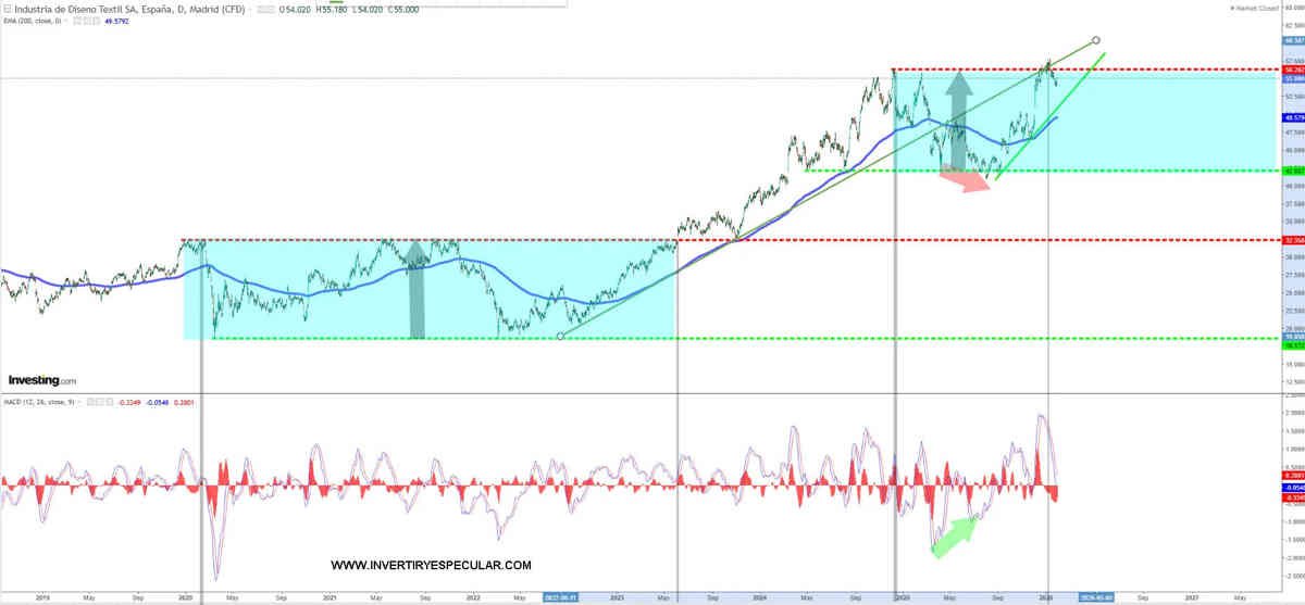 Inditex (ITX:MC) superó los máximos históricos anteriores y abordando los 58 euros se giró, calculamos que si vuelve a intentarlo y medra podría activar los 70 euros de precio objetivo.
