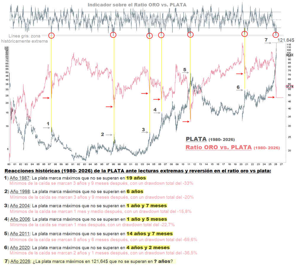 Al examinar el ratio oro/plata, se observan niveles históricamente extremos. Desde 1980, esta es la séptima ocasión en que alcanza lecturas tan elevadas, características de zonas en las que la plata ha consolidado máximos durante periodos prolongados.