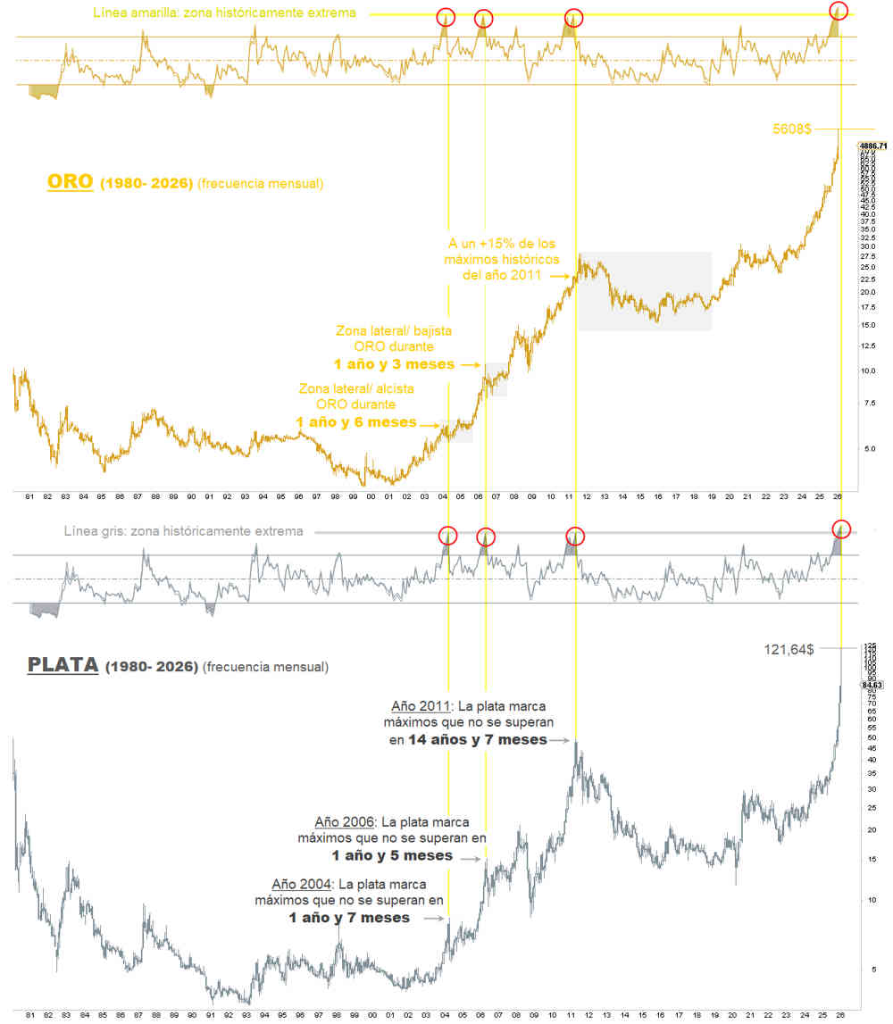 Si admitimos la probabilidad de que un escenario análogo pueda repetirse en esta ocasión, a la vista del anómalo rally alcista de la plata, con un avance del 315 % desde los mínimos de abril de 2025 en apenas 9 meses, y considerando que el nivel de 121,64 dólares podría haber configurado un techo duradero para el metal blanco, cabría inferir una dinámica similar en el oro.