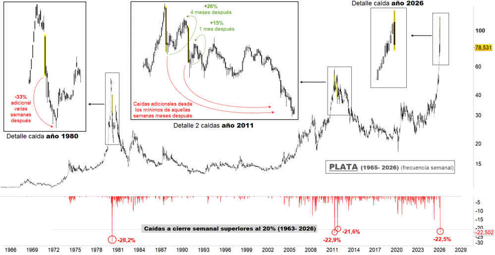 Sin descartar la posibilidad de que, en las próximas semanas o meses, la plata recupere parte del terreno perdido desde los 121,64 dólares, los datos sugieren que dicho nivel podría haber marcado un techo significativo y duradero.