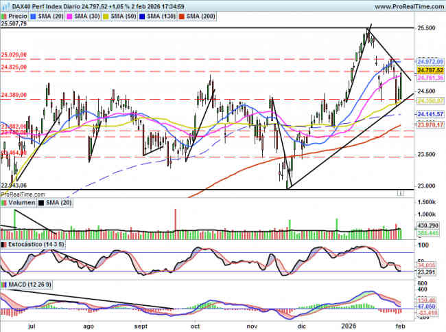 Pese a la incertidumbre global el DAX ha conseguido rebotar de nuevo este lunes en el soporte clave de 24380 puntos, un soporte donde ya hizo mínimos el 21, 28 y 30 de enero.