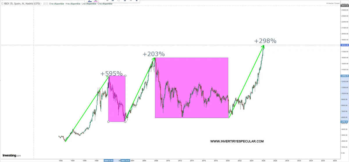 Pero el IBEX35 ayer superaba los 18000 al cierre si medimos porcentualmente el último tramo estaríamos sobre  casi el 300% de rentabilidad partiendo de marzo 2020, en su serie histórica solo hubo un tramo mayor de 1992 al 2000 con una rentabilidad de casi el 600%.