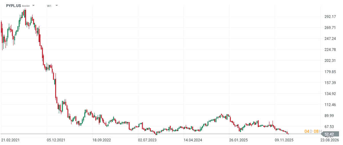 Las acciones de Paypal se desploman casi un 18% después de presentar unos resultados que no han gustado al mercado y que han provocado un cambio de CEO. La compañía sigue cayendo en bolsa y no recupera la confianza de los inversores. Menos aún, con las previsiones para 2026.