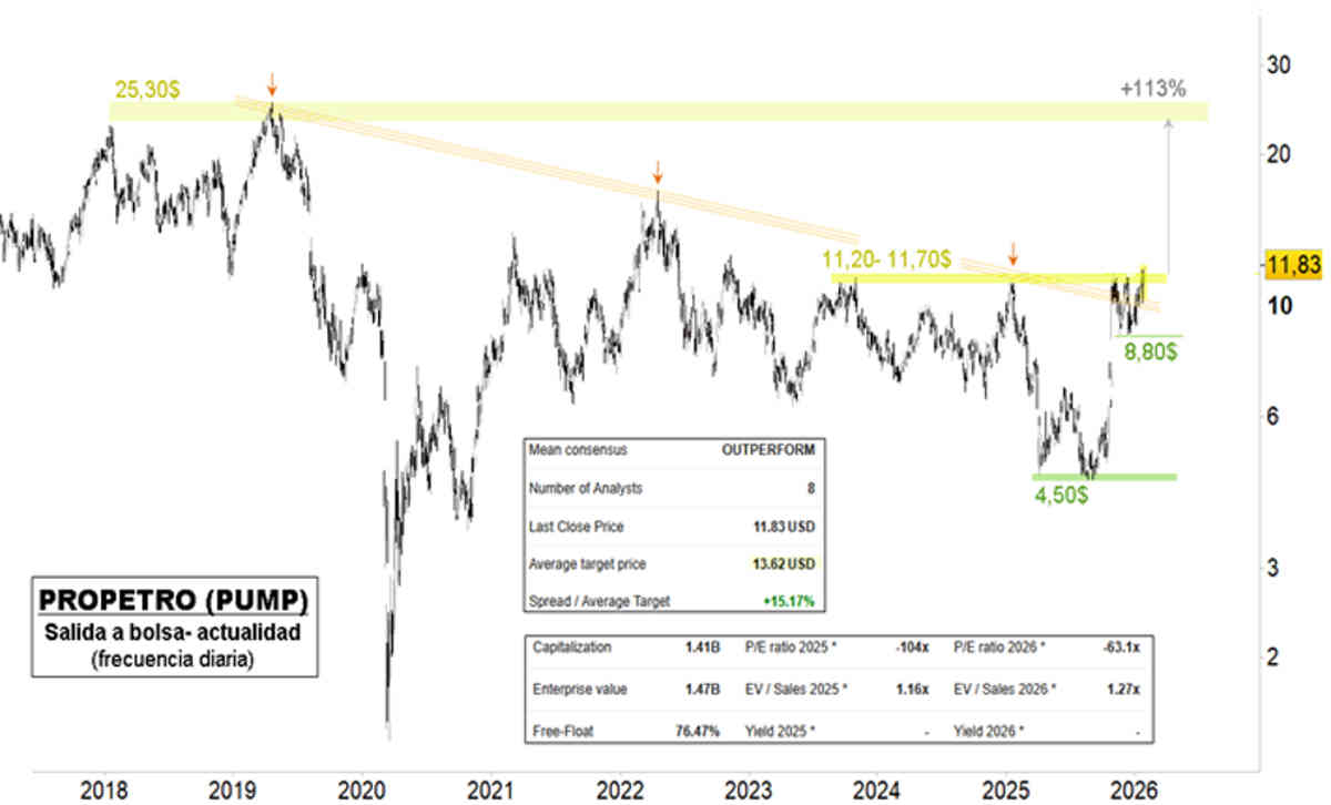 A nivel técnico, presenta una situación de gran atractivo, ya que ayer comenzaba a superar la zona de máximos desde octubre de 2023, que confluye con el paso de la directriz bajista desde sus máximos históricos, en 25,30 dólares, hacia los que ha despejado su camino de resistencias con dicha superación (+113% potencial al alza). La zona de mínimos desde noviembre de 2025, en 8,80 dólares, se configura como su principal soporte inmediato.