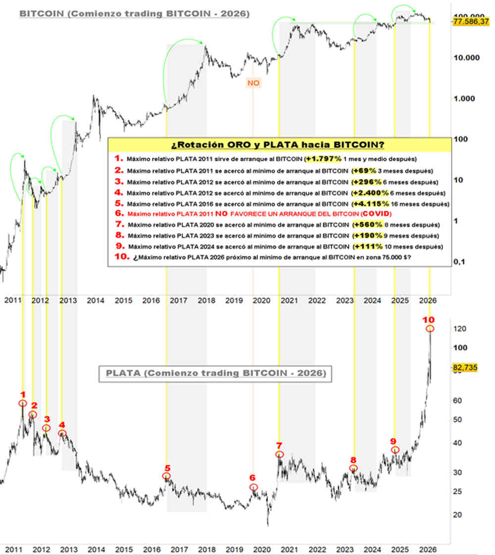 • Secuencia post-pico plata: en 8/9 ocasiones, un máximo relativo importante en plata ha venido de la mano de un rally sostenido de Bitcoin en meses siguientes.