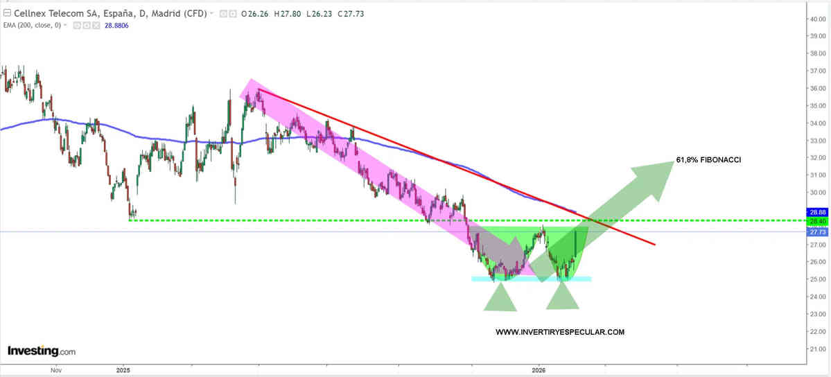 Cellnex (CELL:MC) sube hoy con mucha fuerza dejando tras de si una muy bonita figura de doble mínimo entre finales y principios de año sobre los 24.7 euros. Igual le llega el viento de popa desde EEUU donde el sector teleco parece haber salido de su hibernación con mucha hambre atrasada, necesario es más aún que en la eurozona suceda lo mismo.