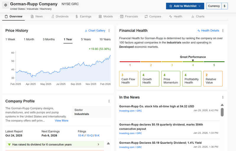 Gorman-Rupp diseña y fabrica bombas industriales para sectores críticos, desde el agua hasta la energía. Las acciones han subido un 53,4% en el último año, impulsadas por un sólido crecimiento de los ingresos, unos pagos de dividendos estables y una “EXCELENTE” Puntuación de Salud financiera de 3,30.