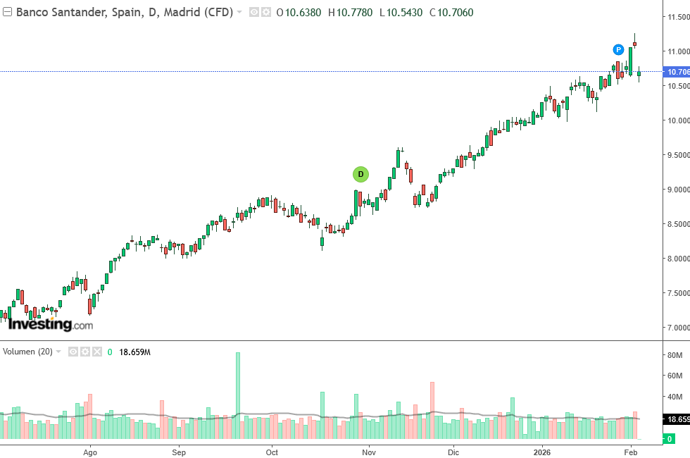 Pese a las caídas de hoy, las acciones de Santander suben más de un 3% en lo que llevamos de 2026.