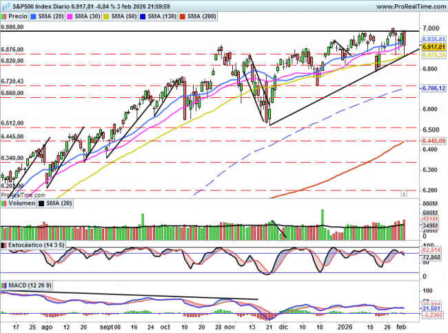 Por debajo si perfora el nivel de 6870 al cierre y posteriormente 6800 que fue el mínimo anual sí que podría acelerarse una corrección quizás con objetivo en 6500.