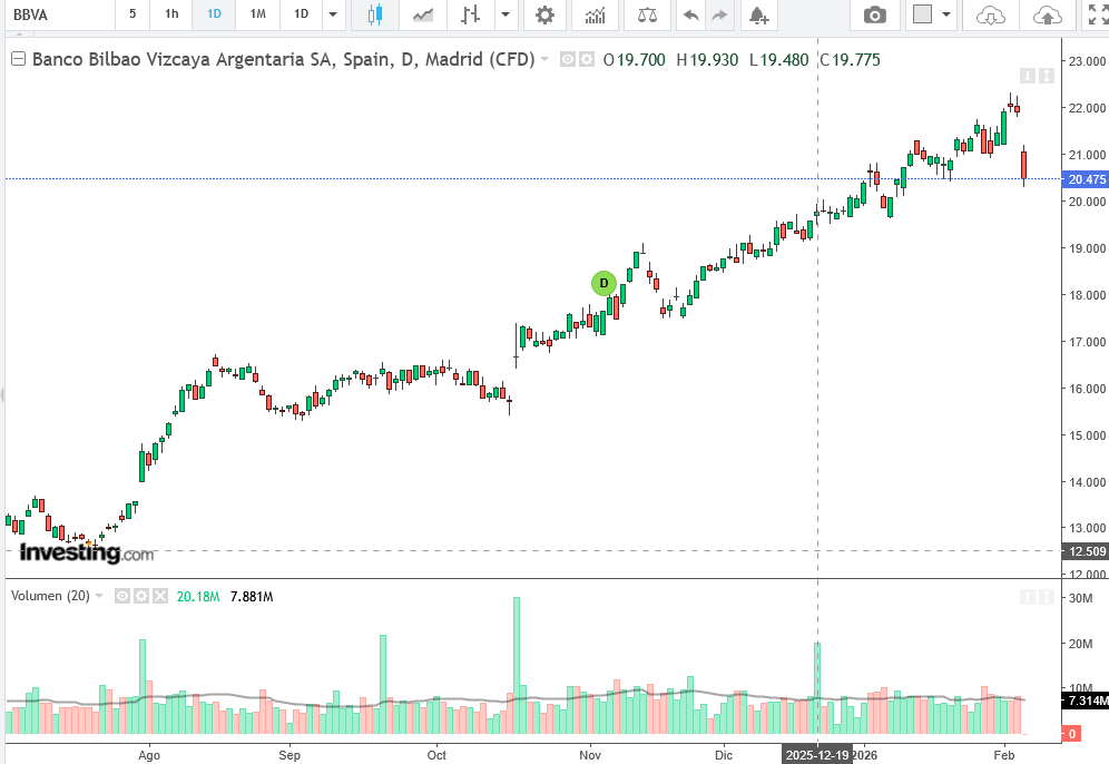 Las perspectivas para el 2026 nos parecen sanas y razonables, con crecimiento ligero tanto en España como en México. Los riesgos que vemos son la ralentización económica en México y la amenaza arancelaria de Trump, mientras que en España vemos una alta propensión del sector a entrar en una guerra de tipos en el mercado hipotecario, lo que puede lastrar considerablemente el margen. En cualquier caso, seguimos pensando que los múltiplos son muy exigentes y el sector no debería tener mucho más recorrido. De hecho, achacamos las caídas de hoy tanto a una cifra de beneficios ligeramente menor a lo esperado como a las provisiones en mercados clave. Cuando se cotiza a múltiplos altos, el mercado no perdona y cualquier cifra no esperada se castiga con ventas.